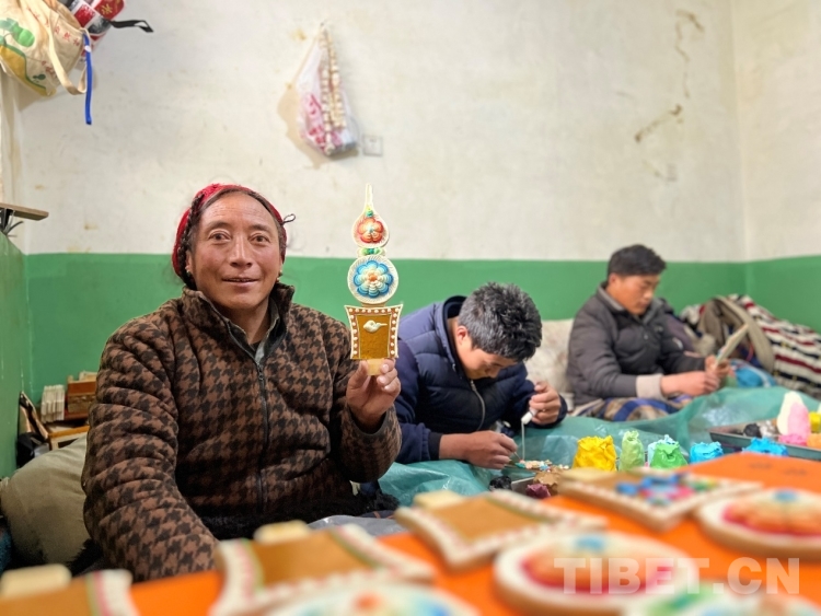 丹增朗杰每天和爸爸、大哥一起從早上8點左右開始捏制,一直持續(xù)到深夜24時許,按圖案復(fù)雜程度,一天可以捏制近7到10余對酥油花。“雖然有點辛苦,但我很喜歡寒假和家人一起來拉薩制作酥油花?!?/span>丹增朗杰說,他從14歲開始學(xué)習(xí)制作酥油花,覺得靠自己的勞動掙錢能讓自己擁有成就感。