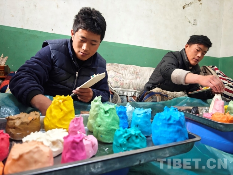 圖為頓珠的兩個兒子正在捏制酥油花