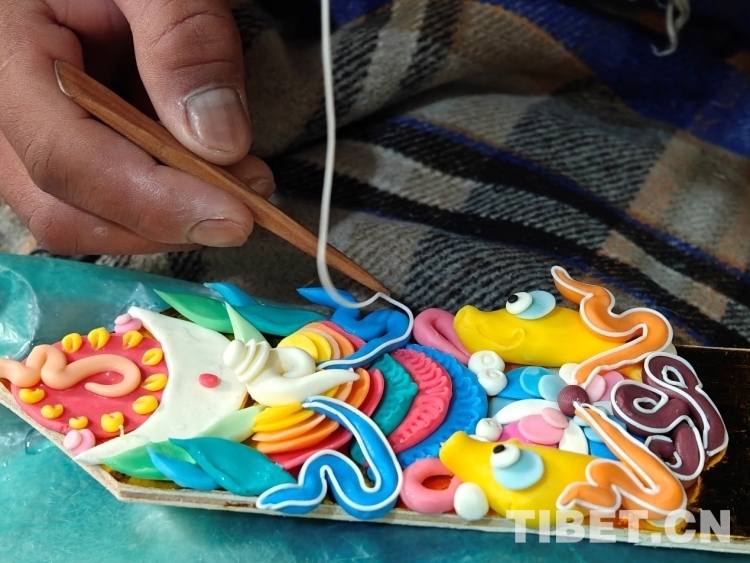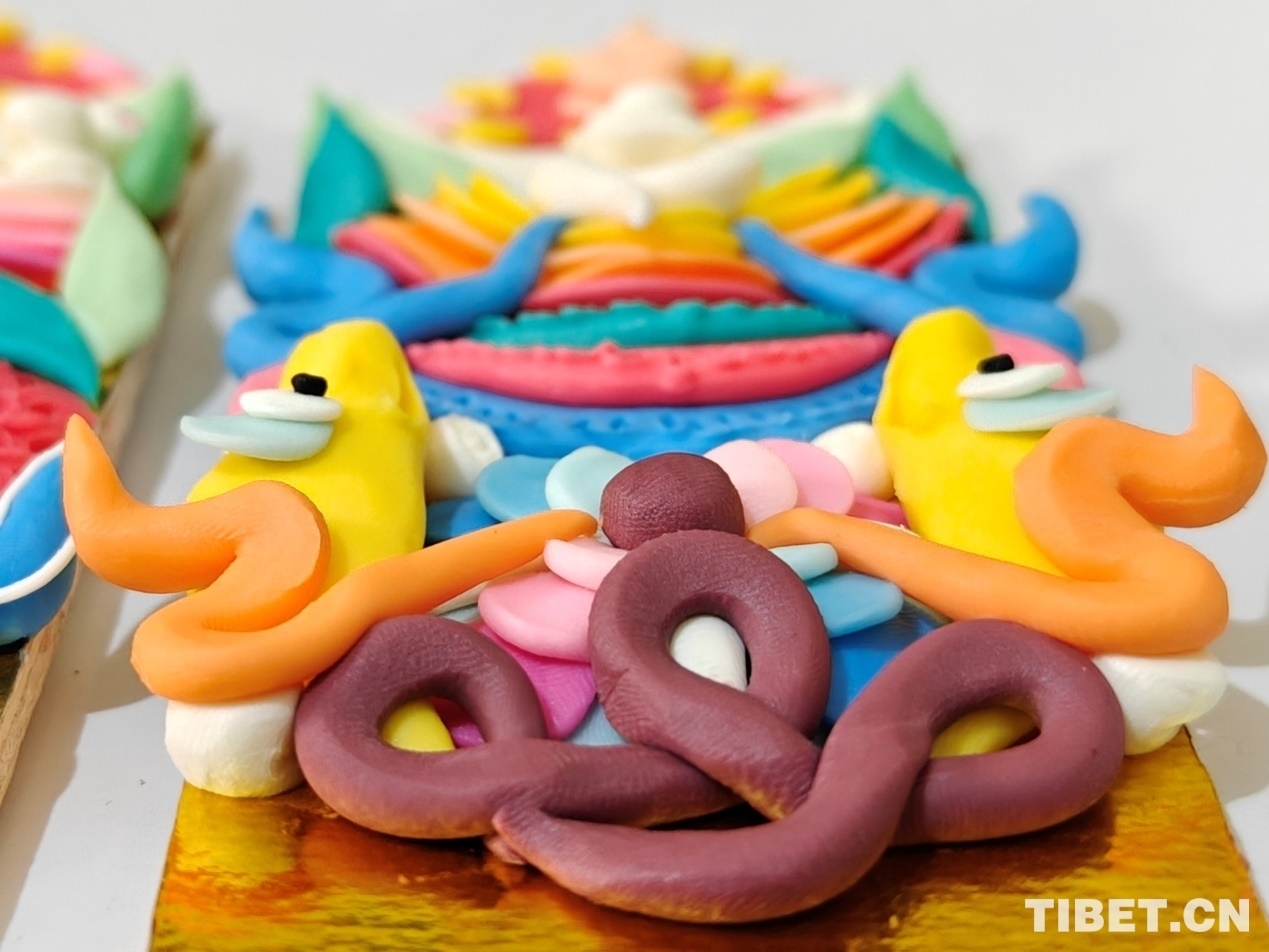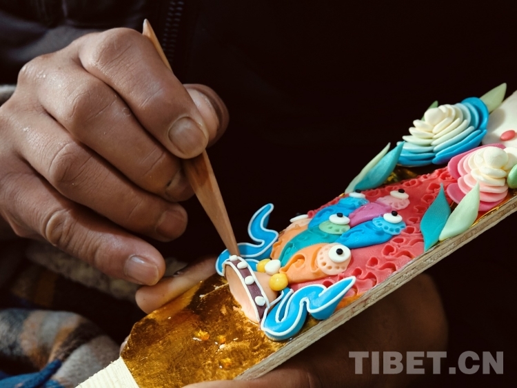 頓珠的二兒子丹增朗杰今年只有19歲,是一名高中生,但制作酥油花的手法已經(jīng)極為嫻熟。他盤腿而坐,面前擺放著調(diào)制好的各色酥油和一盆清水。只見他捏取一小塊酥油在冷水中浸泡一會,然后熟練地用食指和拇指將酥油捏成不同形狀,粘貼于一塊盾形木板上,一對對色彩斑斕、寓意吉祥的酥油花作品便完成了。