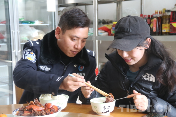氧氣瓶、高原藥品、熱水......接德吉永措的車上已準(zhǔn)備好了各種抗高反和取暖的東西,這讓她提前感受到了來自丈夫單位的熱情與關(guān)懷。與愛人相聚后,旦增洛追帶著妻子參觀營區(qū),迫切地想讓她了解他用青春為之奮斗的警營,隨后他又帶著妻子到單位食堂品嘗自己親自下廚做的紅燒肉?!班牛∥兜篮芎谩!钡录来氤灾煞蚪o她夾的肉,臉上洋溢著幸福的笑容。