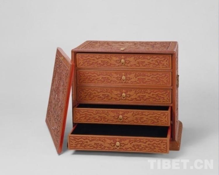箱子兩側(cè)及蓋面紋飾與插門(mén)相同,僅龍紋為單龍戲珠。箱背面為綠色海水,上雕松鶴圖,鶴有六只,寓意“六合同春”“松鶴延年”。箱內(nèi)裝抽屜五具,無(wú)遮擋,寬寬敞敞,屜面雕云龍戲珠紋。底座雕纏枝小朵花卉紋。(中國(guó)西藏網(wǎng) 綜合/周晶)