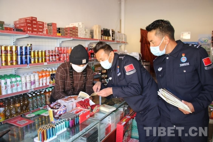 圖為西藏邊檢總站執(zhí)法調(diào)查支隊(duì)民警在西藏日喀則市定日縣商鋪宣傳國家安全知識