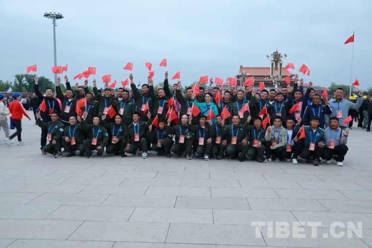 圖為“西藏自治區(qū)野生動物保護員進京考察學(xué)習(xí)團”成員觀看升旗儀式的集體留念 攝影:莫干措