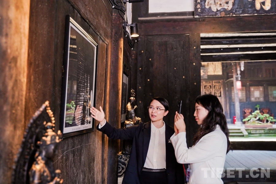 姜氏古茶第十五代傳承人萬姜紅(左)在中國西藏網(wǎng)視頻號直播時向廣大網(wǎng)友介紹姜家大院歷史和有關(guān)老照片的故事 楊洋供圖