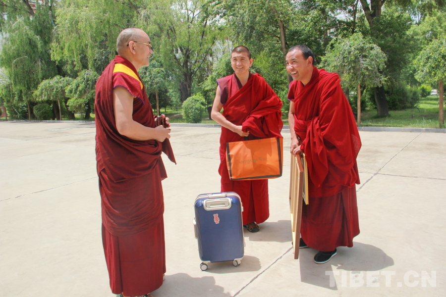 圖為青海省藏語系佛學(xué)院教務(wù)處副處長、特級經(jīng)師悟嘉倉(左一)與準備離校的畢業(yè)學(xué)僧交談 攝影:劉莉