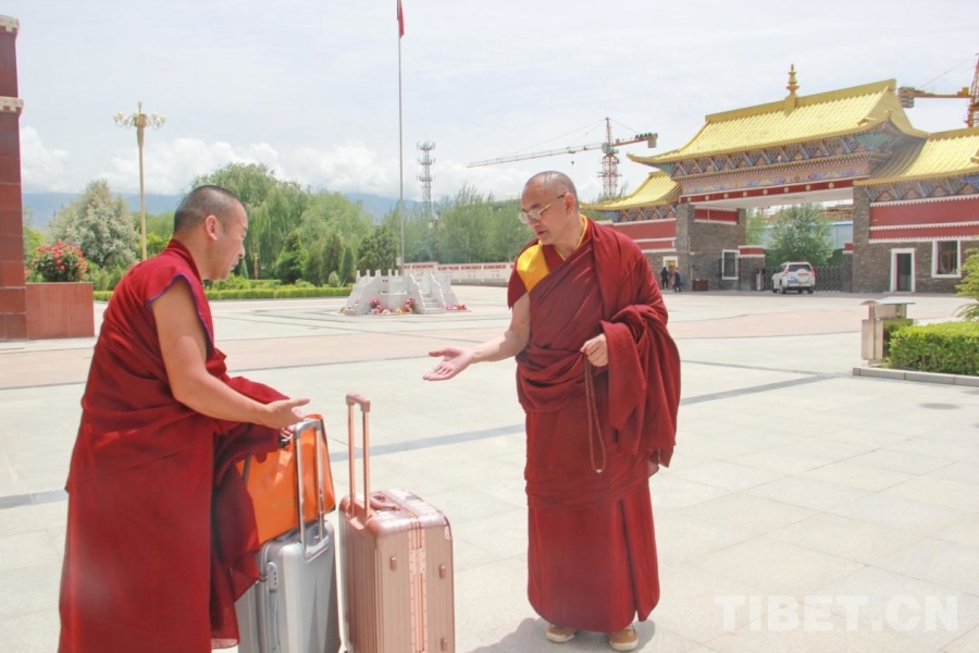 圖為青海省藏語系佛學(xué)院教務(wù)處副處長、特級經(jīng)師悟嘉倉(右一)與準備離校的畢業(yè)學(xué)僧交談 攝影:劉莉