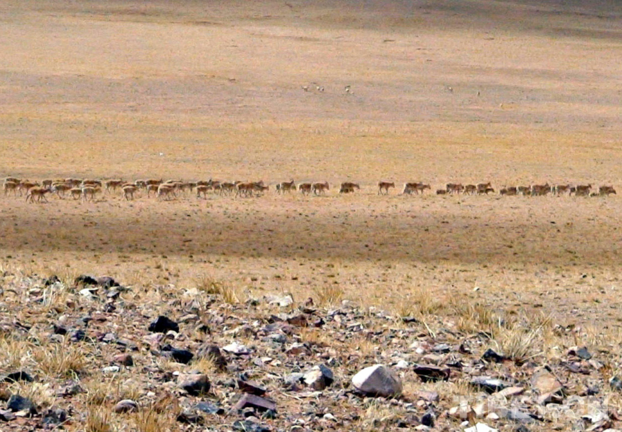 圖為羌塘國家級(jí)自然保護(hù)區(qū)正在遷徙產(chǎn)羔的成群藏羚羊(唐召明2006年攝)
