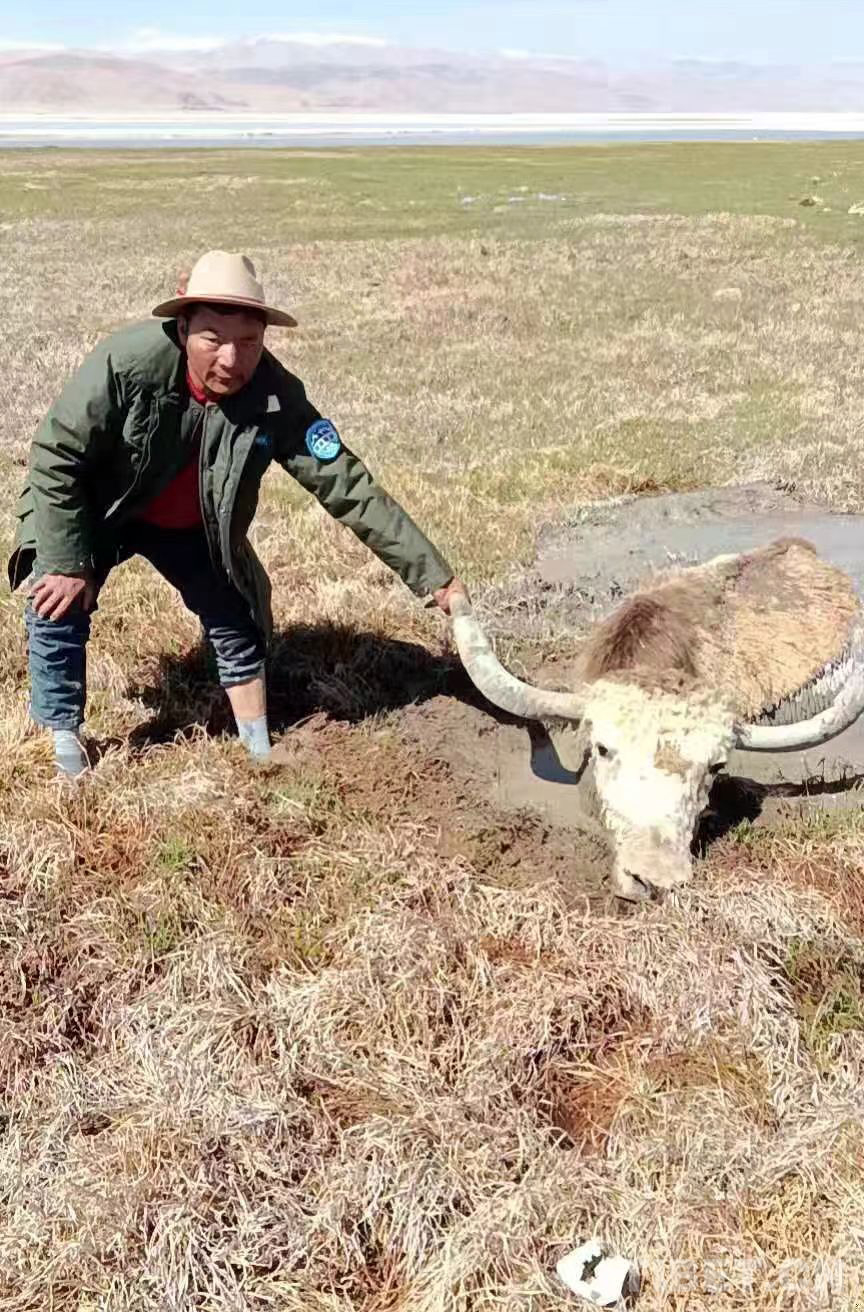 圖為西藏阿里地區(qū)革吉縣野生動(dòng)物保員正準(zhǔn)備救助一頭陷入沼澤地的金絲野牦牛(野保員洛洛提供圖片)