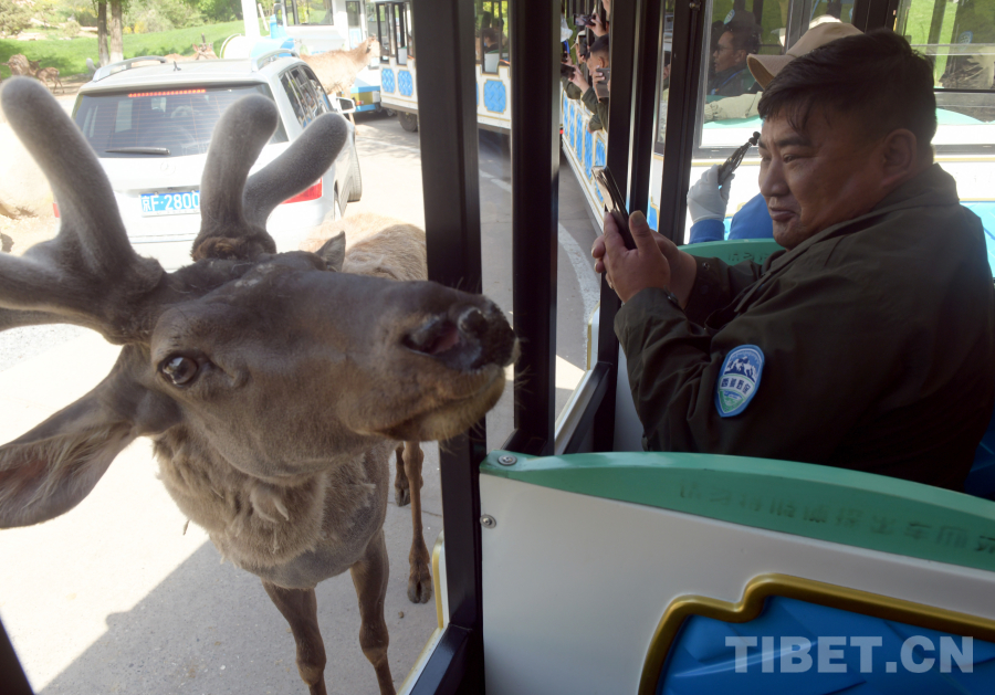 圖為西藏野保員在北京野生動(dòng)物園參觀時(shí),一只梅花鹿好奇地探頭到觀光游覽車,與西藏野保員親密接觸(唐召明2024年4月24日攝)