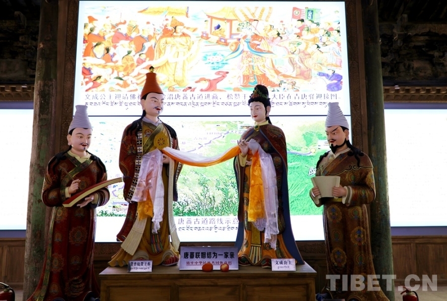 圖為宏覺(jué)寺鑄牢中華民族共同體意識(shí)體驗(yàn)館內(nèi)“唐蕃聯(lián)姻”塑像 攝影:王茜