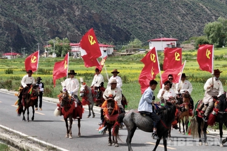 清晨,洛隆縣孜托鎮(zhèn)格亞村和夏果村的農(nóng)牧民黨員以“洛隆兒女心向黨”為主題,高舉著黨旗和國(guó)旗,在嘹亮的歌聲中騎馬巡游,以農(nóng)牧民黨員特有的方式,表達(dá)對(duì)黨的無(wú)限深情和美好祝福。