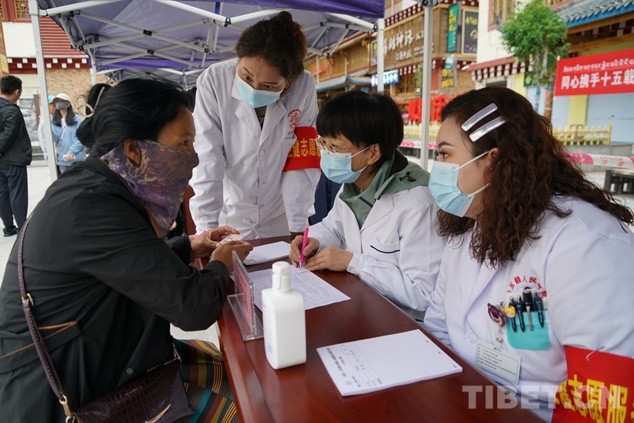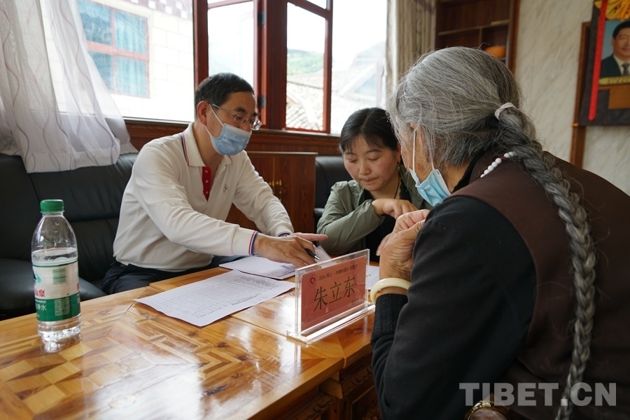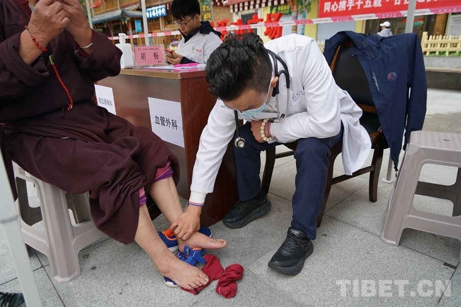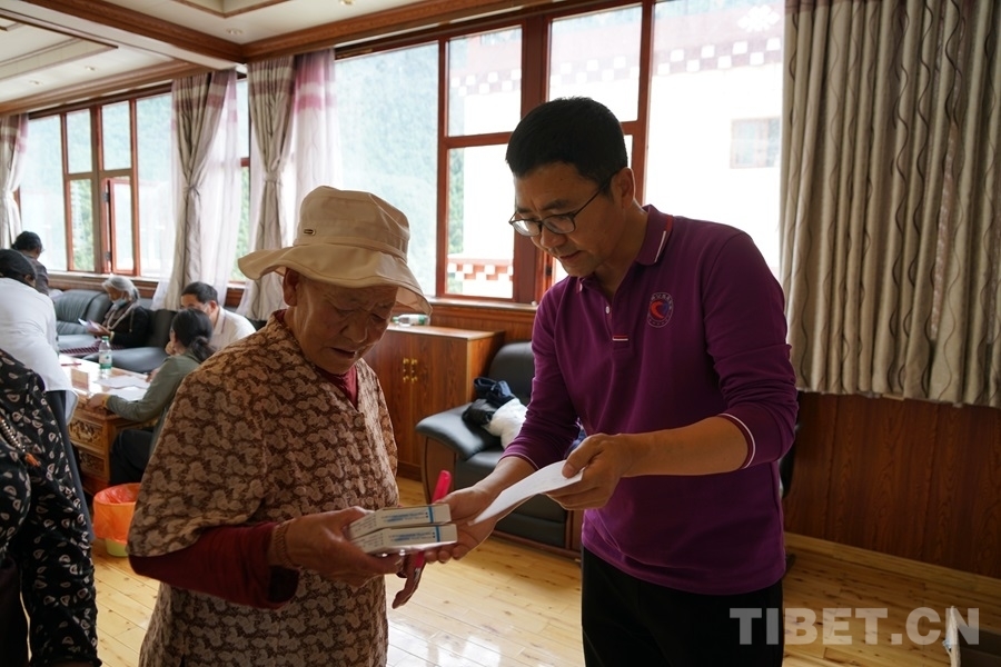 得知有來自北京的醫(yī)療專家為大家義診,家住白玉縣城的切呷一大早便帶著父母來到了義診現(xiàn)場(chǎng)。她的母親澤仁拉嘎今年75歲,自述下肢從腰間、腿部到腳尖都會(huì)發(fā)麻、有疼痛感,行走時(shí)腰部會(huì)很累,偶爾還會(huì)因?yàn)榭刂撇缓猛炔炕顒?dòng)而摔倒。北京水利醫(yī)院創(chuàng)傷骨科副主任醫(yī)師王耀輝在經(jīng)過詳細(xì)問診后,為拉嘎阿媽開具了營(yíng)養(yǎng)神經(jīng)的藥品,并建議她進(jìn)一步做胸椎和腰椎方面的檢查。