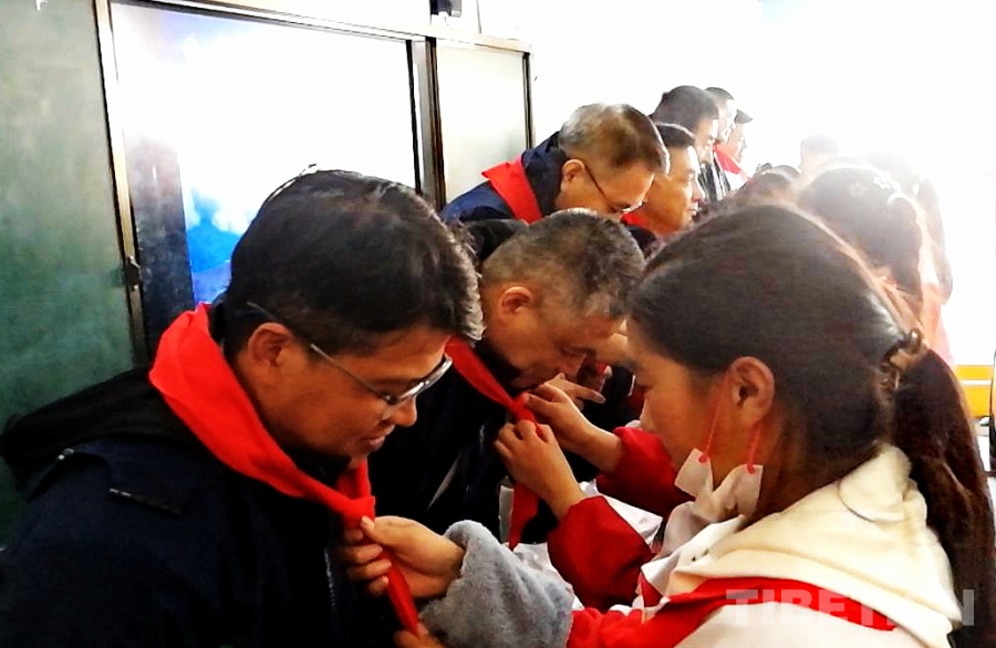 圖為四川省甘孜州石渠縣第二完全小學學生為醫(yī)療專家們獻上鮮艷的紅領(lǐng)巾 攝影:劉莉