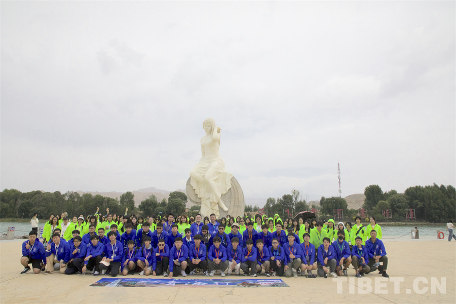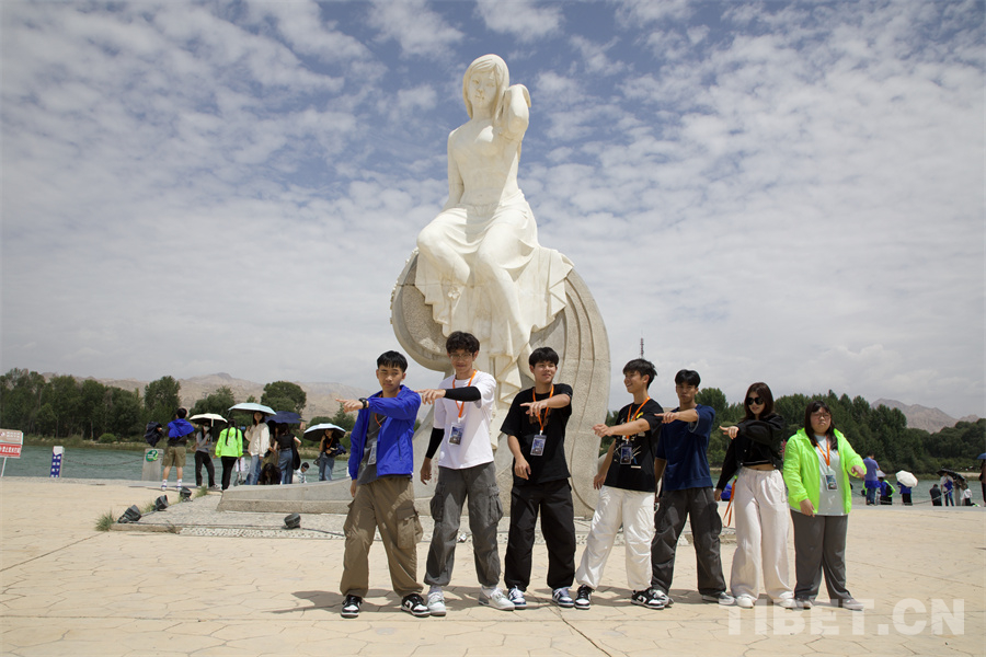 圖為香港交流團青少年在貴德黃河少女雕塑前合影留念 攝影:桑吉