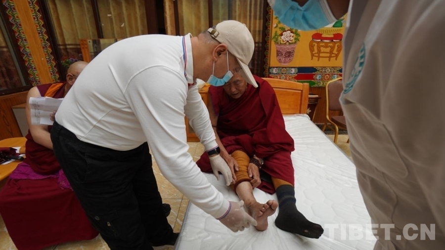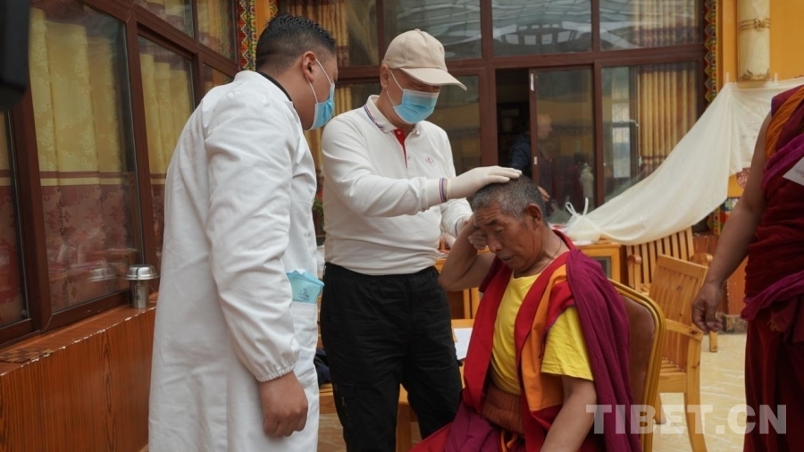 中國西藏網(wǎng)訊 7月10日,“同心·共鑄中國心”公益醫(yī)療團隊走進四川省甘孜藏族自治州理塘縣長青春科爾寺(又名理塘寺),為寺內(nèi)僧人義診。現(xiàn)場義診的專家們平均年齡都在四十歲以上,他們都是一邊與高原反應抗衡一邊堅持義診,秉承著“缺氧不能缺精神”的態(tài)度堅持工作。