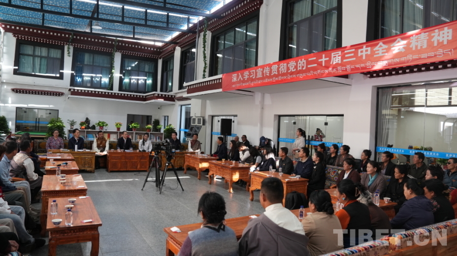 圖為夏薩蘇社區(qū)干部群眾共同學習黨的二十屆三中全會精神,分享交流學習體會。攝影:德吉卓瑪