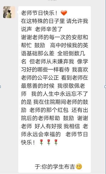 上大學(xué)時(shí),?我?guī)е鴱哪抢飳W(xué)到的堅(jiān)韌和自信,?踏入了這個(gè)全新的世界。?雖然大學(xué)生活與高中截然不同,?挑戰(zhàn)也更多,?但我始終記得您的教誨,?知道只要努力,?就沒有什么是不可能的。??每當(dāng)遇到困難,?我都會(huì)告訴自己,?就像您曾經(jīng)幫助我克服英語(yǔ)難題一樣,?我也能在這里找到屬于自己的路,于是更加堅(jiān)定了前進(jìn)的決心。?