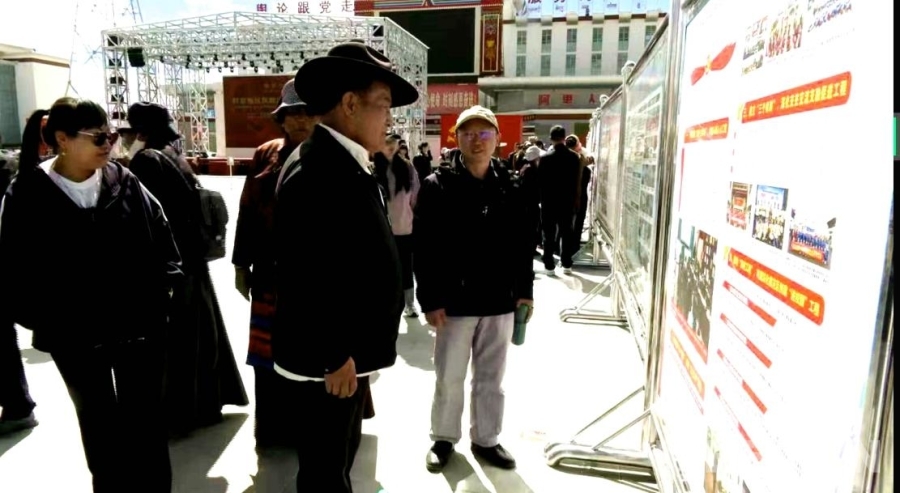 圖為干部群眾參觀民族團(tuán)結(jié)進(jìn)步創(chuàng)建成果展板 阿里地區(qū)融媒體中心供圖