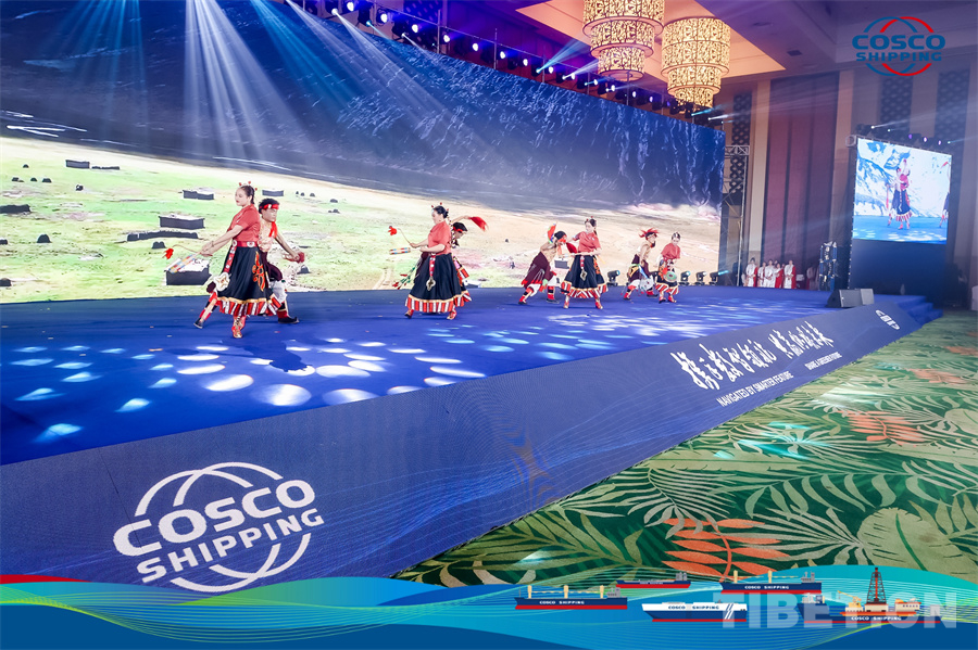 圖為洛隆縣藝術(shù)團(tuán)在中遠(yuǎn)海運(yùn)特運(yùn)2024全球合作伙伴大會(huì)上精彩亮相
