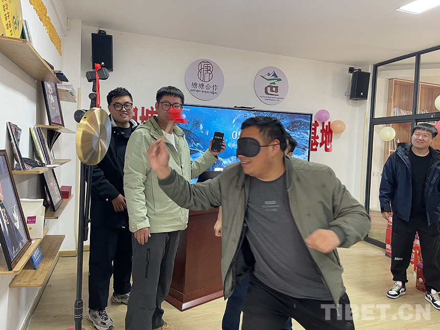 猜燈謎、投壺、蒙眼敲鑼等活動相繼舉行,現(xiàn)場熱鬧非凡。投壺是中國古代一種博弈助興的游藝,專技人才們參與積極性極高,紛紛尋找角度,穩(wěn)住心態(tài),瞄準壺口投射,投中者贏得陣陣掌聲;蒙眼敲鑼的環(huán)節(jié)將本次活動推向了高潮,大家自由結對,接力在蒙住雙眼的條件下,僅憑借隊友的引導敲響銅鑼。