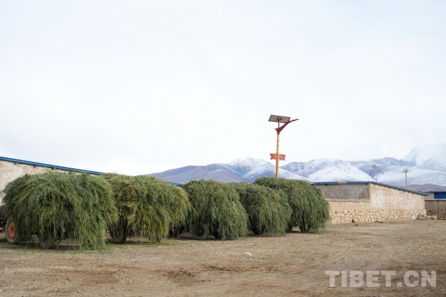 圖為雪山下的養(yǎng)羊合作社內(nèi),已經(jīng)裝好車的燕麥草 攝影:邊子捷