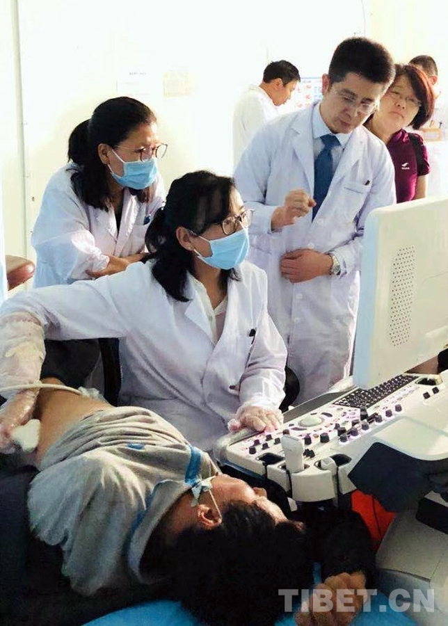 圖為夏宇(左三)援藏期間,在西藏自治區(qū)人民醫(yī)院超聲醫(yī)學(xué)科指導(dǎo)當?shù)蒯t(yī)生做超聲檢查工作(夏宇提供圖片)