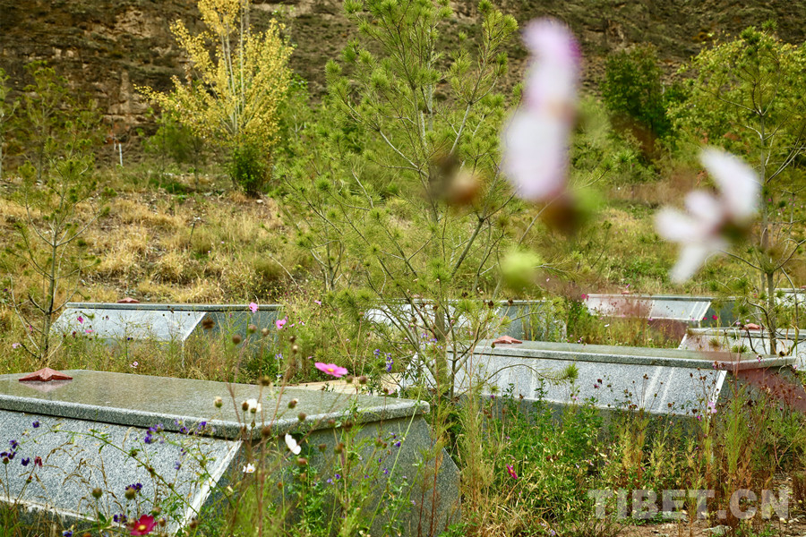 圖為鮮花綠樹圍繞著的烈士石棺槨 攝影:龍真多吉