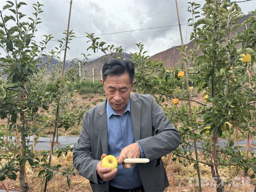 圖為煙臺(tái)大山果業(yè)開(kāi)發(fā)有限公司高級(jí)農(nóng)藝師曲寶君正在拿機(jī)器測(cè)試維納斯黃金蘋(píng)果的糖分 攝影:王妍丹
