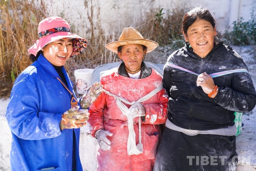 “布達(dá)拉宮外墻的白色涂料主體是來源于拉薩市當(dāng)雄縣羊八井和日喀則市仁布縣一帶的高嶺土,也就是我們通常所說的白灰。為了保證涂料的黏性和光澤度,在白灰兌上水后,我們會加入牛奶、白糖、牛骨膠、植物膠等配料。這些配比都是由長期從事布達(dá)拉宮文物保護(hù)的工匠來操作的,每種原材料的比例都是經(jīng)過匠人們長期的經(jīng)驗(yàn)積累所總結(jié)出的最佳配比方案。我們經(jīng)常會遇到群眾在幫忙的過程中在配比好的涂料中加入自己隨身攜帶來的牛奶等物,我們能夠理解群眾善良質(zhì)樸的心情,但其實(shí)改變了涂料配比后原有的黏度、光澤度都會改變,是不利于文物保護(hù)的?!边叞铜傔_(dá)說布達(dá)拉宮管理處每年都會在粉刷季向群眾和游客科普文物保護(hù)知識,希望群眾和游客在參與粉刷之時能夠遵守秩序,共同保護(hù)好這一文化遺產(chǎn)。