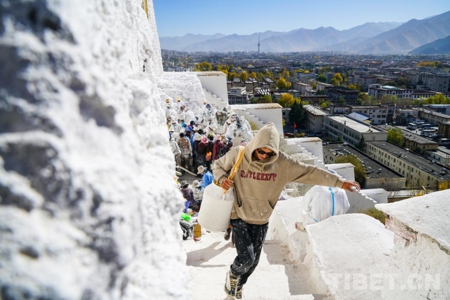 布達(dá)拉宮外墻粉刷一般持續(xù)7-10天,要在藏歷的9月22日之前全部完成。此刻,拉薩的雨季剛剛結(jié)束,冬季的寒冷結(jié)冰尚未到來,每年大家都趕在入冬之前完成這一浩大的粉刷工程。