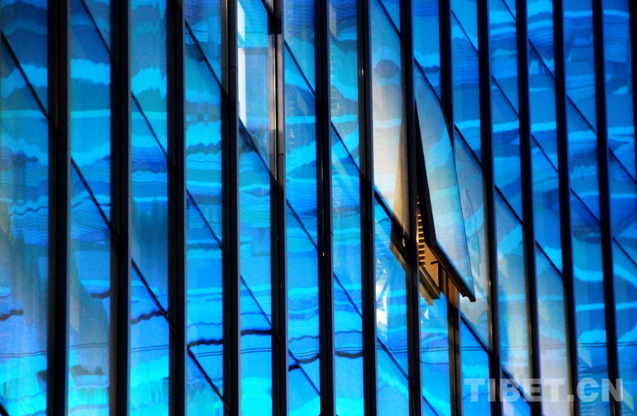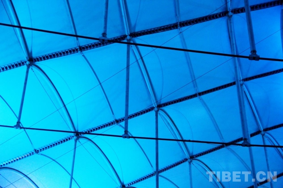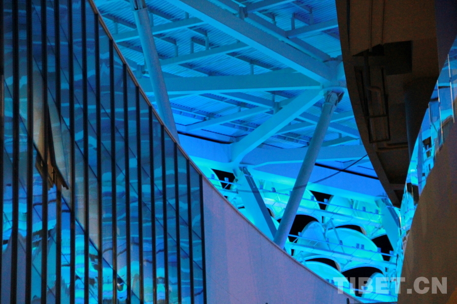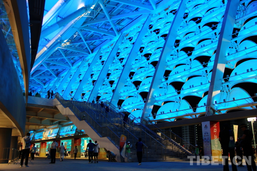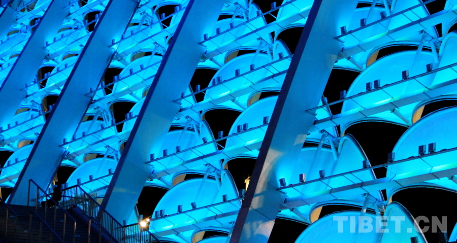 圖為三亞市體育中心體育場內(nèi)部的玻璃結(jié)構(gòu)反射的藍色燈光 攝影:劉莉