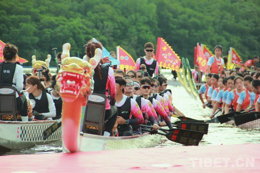 圖為第十二屆全國少數(shù)民族傳統(tǒng)體育運(yùn)動(dòng)會(huì)龍舟項(xiàng)目各參賽隊(duì)蓄勢待發(fā) 攝影:劉莉