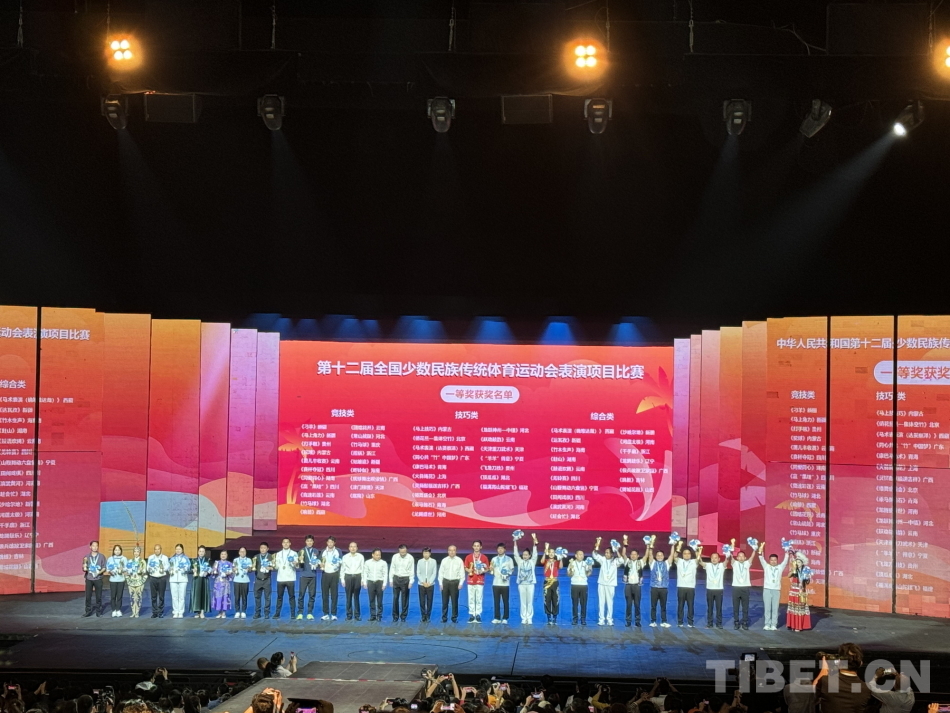 中國西藏網(wǎng)訊 11月29日晚,第十二屆全國少數(shù)民族傳統(tǒng)體育運動會(以下簡稱“運動會”)表演項目頒獎晚會在海南三亞舉行。本屆運動會表演項目共計170個,共決出54個一等獎。其中,西藏隊獲得3個一等獎。
