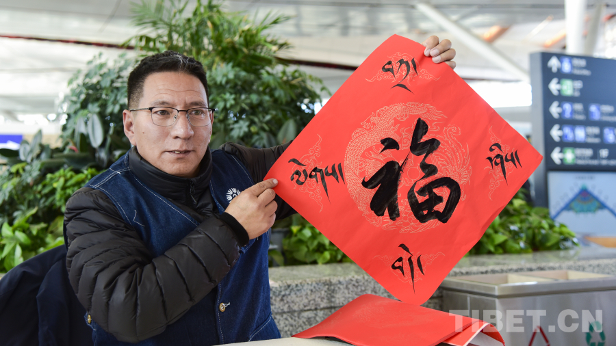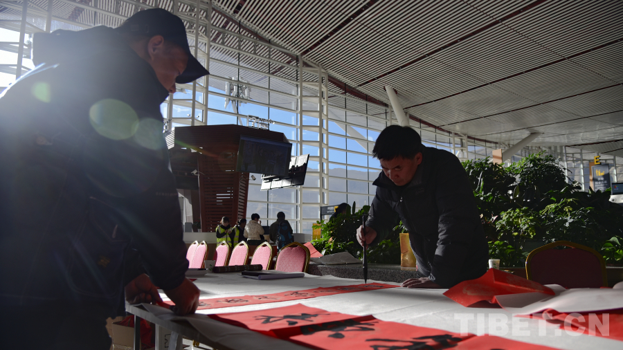 活動(dòng)現(xiàn)場(chǎng),29名西藏文藝志愿者走進(jìn)拉薩貢嘎國(guó)際機(jī)場(chǎng)航站樓,開(kāi)展送“福”字、送“扎西德勒”、送春聯(lián)、扎木念彈唱等活動(dòng),為過(guò)往旅客和工作人員帶來(lái)了一場(chǎng)別開(kāi)生面的文化體驗(yàn)。