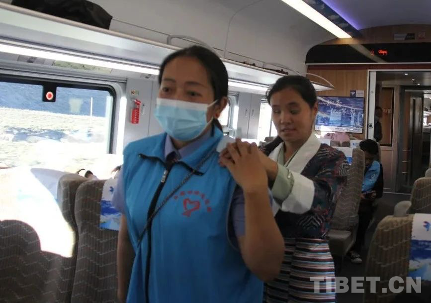 圖為“三站一途 天路導(dǎo)航”團(tuán)隊(duì)在高原復(fù)興號(hào)上幫助視障旅客