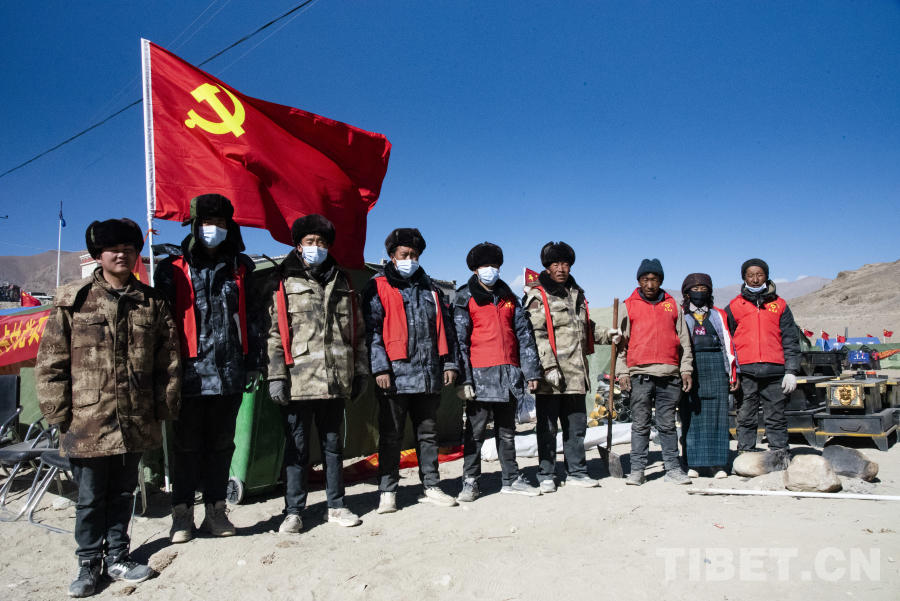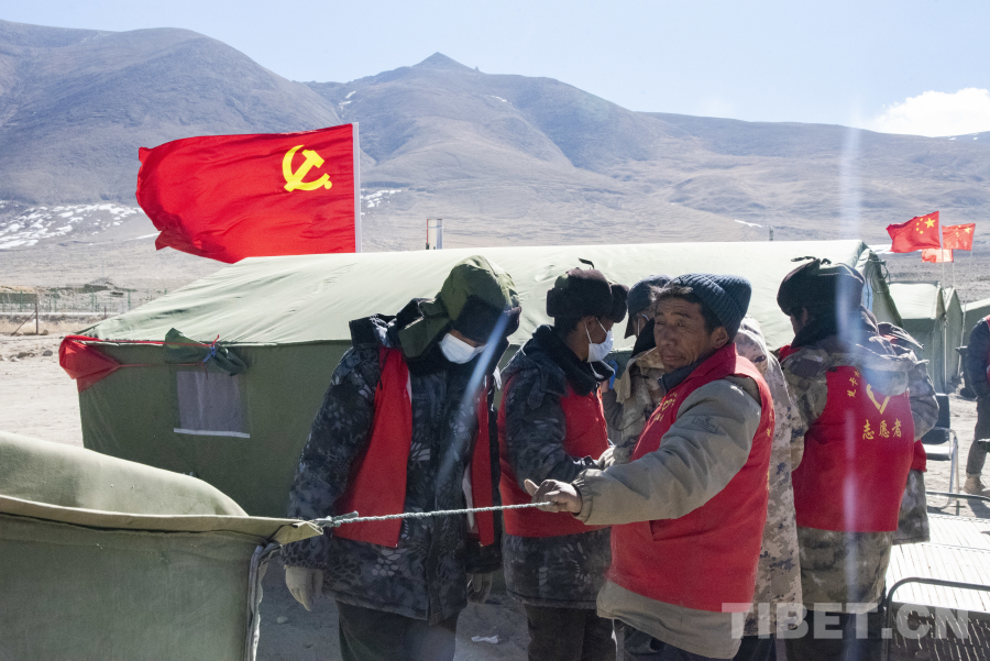 圖為楚卡村黨員志愿者正在為受災(zāi)安置點的帳篷進行加固 攝影:趙振宇
