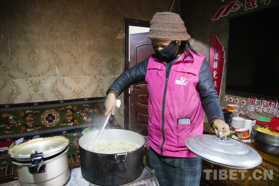 圖為達娃央宗正在廚房內(nèi)與村巾幗服務(wù)志愿者為村莊老人小孩以及工作人員制作午餐 攝影:趙振宇