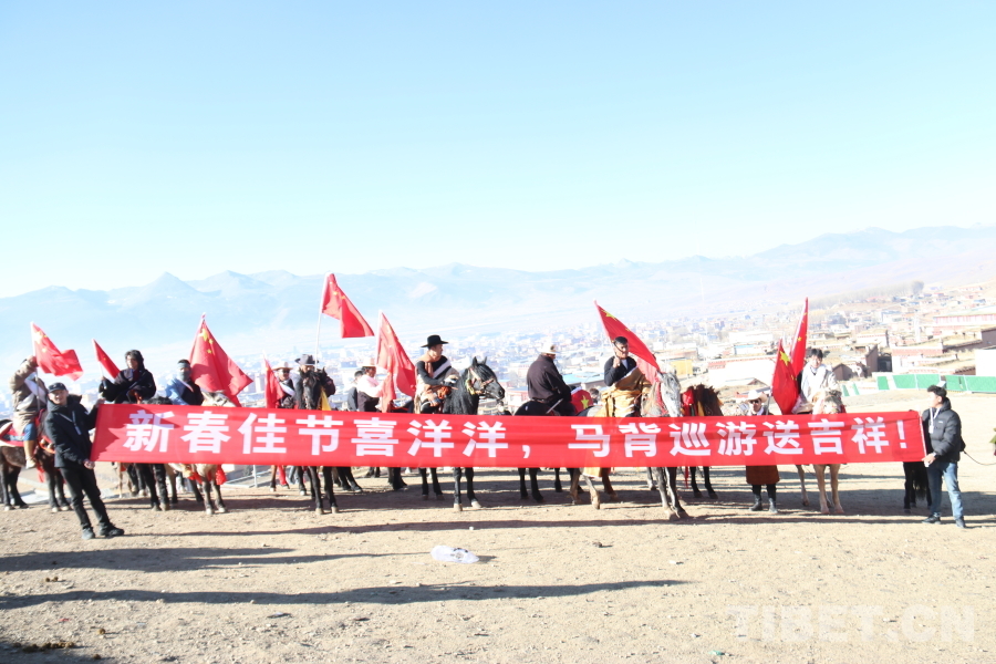 馬術(shù)巡游隊(duì)伍來(lái)到理塘東山頂上,俯瞰縣城全景,并展開(kāi)祝福橫幅,用藏漢雙語(yǔ)高聲祝愿全國(guó)各族人民新春吉祥。