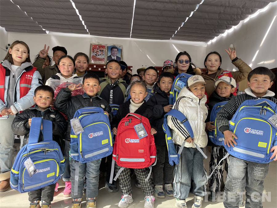 圖為西藏洛隆縣組織志愿者們?yōu)楹⒆觽冑浰蛯W習用具
