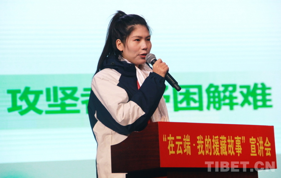圖為四川省攀枝花市農(nóng)業(yè)農(nóng)村局干部揚(yáng)秀英講述該局黨組成員、副局長(zhǎng)寧秀蓉的援藏故事 攝影:劉莉