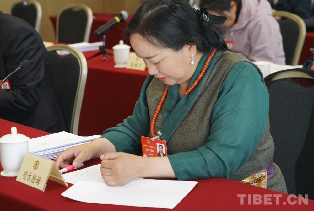 圖為明吉措姆在全國(guó)政協(xié)十四屆三次會(huì)議民族界小組會(huì)議上發(fā)言攝影:楊眉笑
