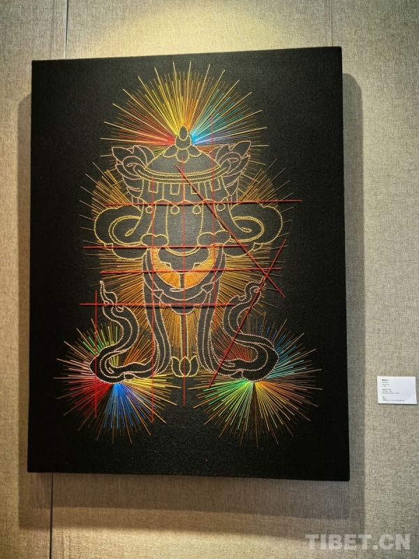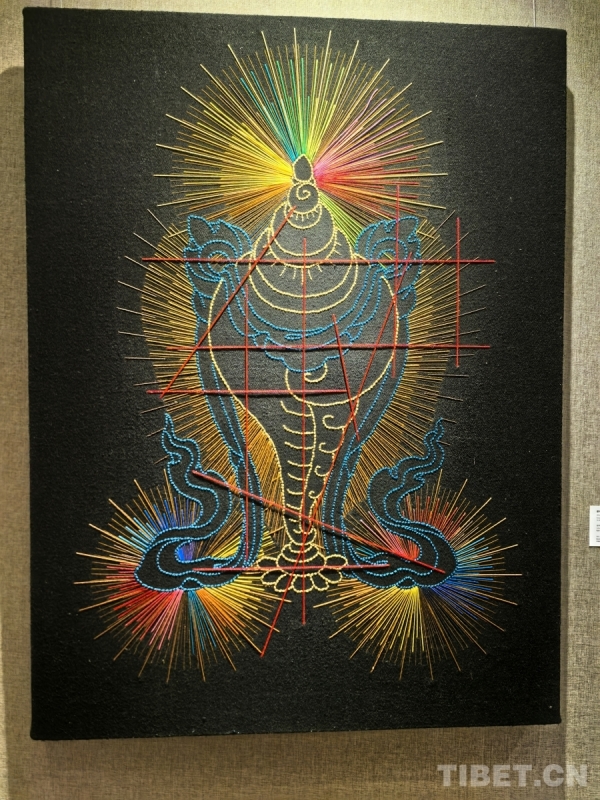 索喃次仁的作品慣以手工羊絨布為面,彩色羊毛線為語(yǔ)言,呈現(xiàn)標(biāo)志性的“彩虹”元素?!埃ㄎ鞑兀﹤鹘y(tǒng)的藝術(shù)是有一定標(biāo)準(zhǔn)的,而當(dāng)代藝術(shù)是可以無(wú)界的,包括材質(zhì)、材料都可以有所創(chuàng)新,是表達(dá)個(gè)人情感和生活的一種藝術(shù)形式。我常常問(wèn)自己,能不能突破傳統(tǒng)?可不可以做一些比較新的東西?像我現(xiàn)在創(chuàng)作選擇用羊絨布,就是我的一種情感表達(dá),因?yàn)椋ㄋ┡c我的家鄉(xiāng)有深切關(guān)系?!彼鬣稳式忉尩?/span>:“比如說(shuō)這一幅作品,佛像外呈現(xiàn)出一種彩虹的狀態(tài)。因?yàn)椴屎绫旧硎且粋€(gè)無(wú)常的現(xiàn)象,而我之前學(xué)過(guò)唐卡佛像,所以把佛像和彩虹理念結(jié)合了,這既是一種傳承,也是突破?!?/span>