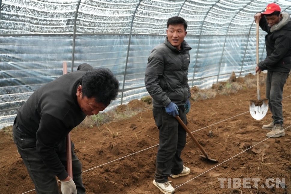 圖為紅太陽家庭農(nóng)場員工普布扎西(中)和同事們在大棚里平整土壤 攝影:王茜