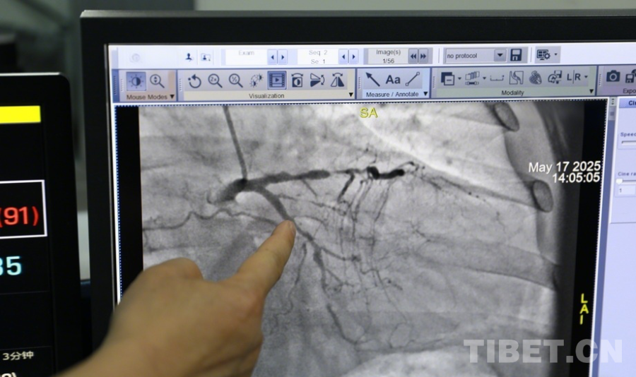 圖為陰赪茜趕赴阿壩州人民醫(yī)院手術(shù)救治急性心?;颊?,屏幕上顯示出患者心臟血管多處問(wèn)題嚴(yán)重 攝影:劉莉