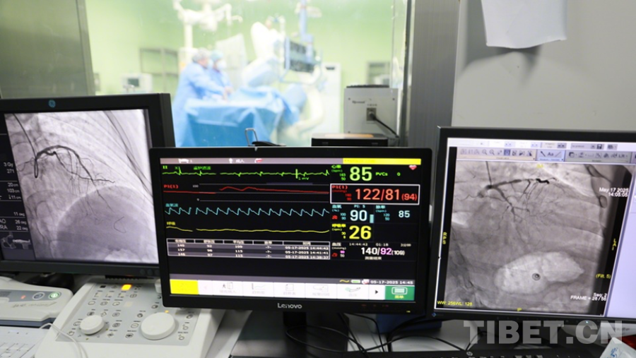 圖為陰赪茜(手術(shù)室內(nèi)右)趕赴阿壩州人民醫(yī)院手術(shù)救治急性心?;颊?,通過(guò)比對(duì)屏幕上的畫(huà)面,術(shù)后(左側(cè)屏幕)患者的心臟血管血流已較術(shù)前明顯恢復(fù) 攝影:劉莉