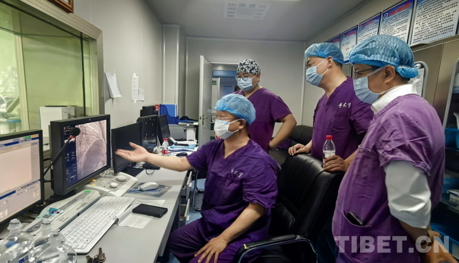 圖為陰赪茜(手術(shù)室內(nèi)右)趕赴阿壩州人民醫(yī)院手術(shù)救治急性心?;颊?,屏幕上顯示出陰赪茜正操作纖細(xì)的導(dǎo)絲嘗試通過(guò)患者發(fā)生閉塞的心臟血管 攝影:劉莉