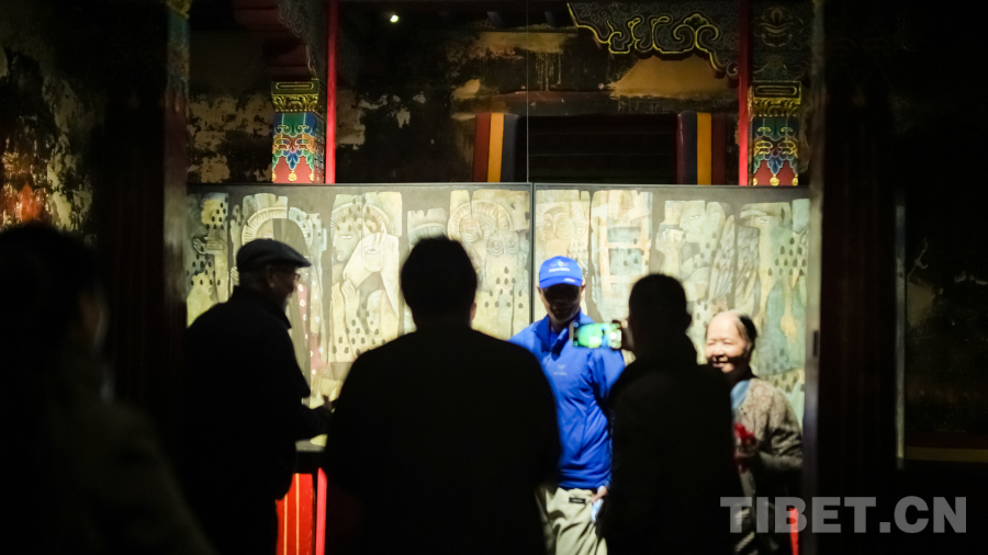 此次展覽中,策展人以“藏地傳統(tǒng)的當(dāng)代轉(zhuǎn)化”為主線,梳理上述不同系列作品,完整呈現(xiàn)出藝術(shù)家的創(chuàng)作脈絡(luò)。展覽標(biāo)題“夢瑜伽”,來自《黑經(jīng)書》系列作品的創(chuàng)作故事,清代壁畫環(huán)繞的獨(dú)特古建場域與《黑經(jīng)書》系列作品于光影間輝映,共同營造出西藏藝術(shù)歷史與當(dāng)下交錯的鏡像,在搭建橋梁、連結(jié)傳統(tǒng)與時(shí)代精神的同時(shí),也引領(lǐng)觀眾走入高強(qiáng)度的精神性探索。