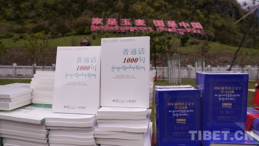 圖為《普通話1000句》漢藏對照版、《國家通用語言文字學習詞典》(藏文對照)等書籍