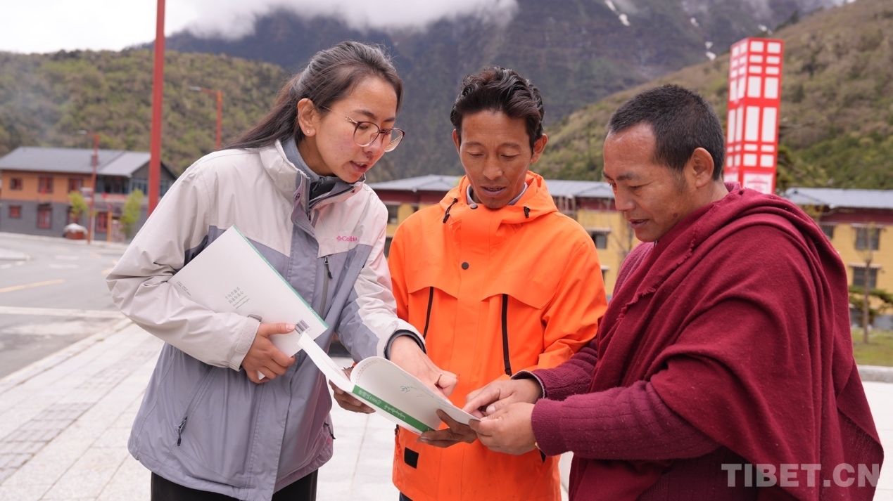 圖為西藏自治區(qū)藏語委辦(編譯局)工作人員為玉麥鄉(xiāng)群眾指導(dǎo)學習方法