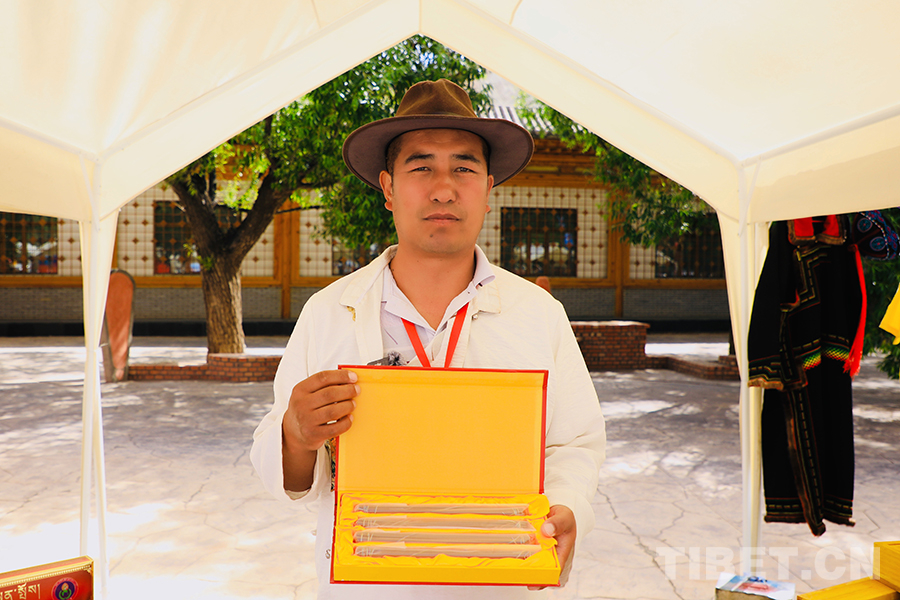 “我今天主要帶來的是我們的工藝產(chǎn)品‘供養(yǎng)藏香’,這些包裝樣式不一的藏香根據(jù)規(guī)格大小都有各自的價位,但每一根藏香上付出的心血及所使用的工藝和配料都一致,其中我們也更注重藏香的配料,都是精心篩選的白檀香、藏紅花、安息香、白黑沉香、甘松等二十多種源自高原的天然藥物和香味植物。”當問到目前的銷售情況時,他坦言道:“今天賣出去的并不是很多,不過今天能和眾多的優(yōu)秀手工藝人同臺參展機會難得,對我來說也是一種學習和展現(xiàn)的契機?!?/p>